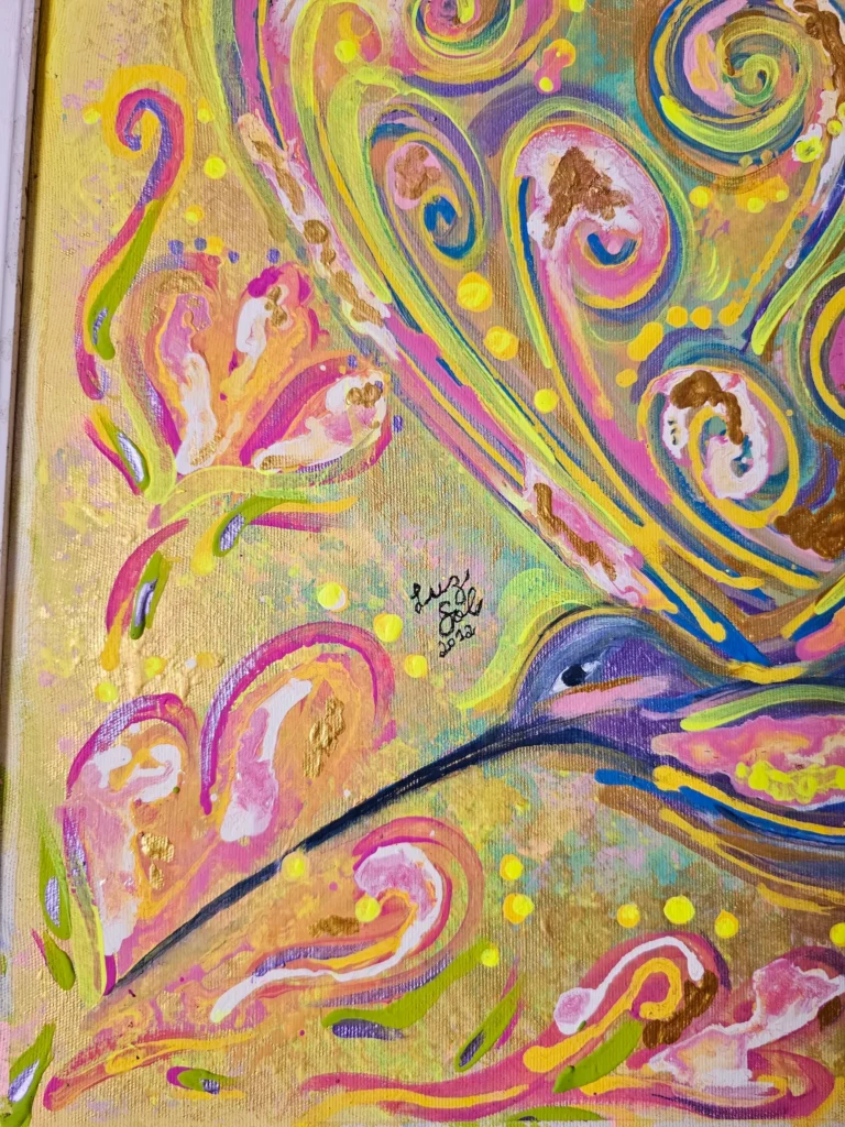 As telas que você vê aqui no site são portais de amor que se abrem pra consciência … É como se a alegria e a abundância das músicas de Luz Sol tivessem se solidificado em texturas de ouro , turquesa, coloridos se destacando traduzindo inclusive a negra luz do infinito Universo… No ateliê, entre sentimentos pensamentos conectados em melodias e pinceladas, ela manifesta o que há de mais sagrado: a capacidade de transformar som em matéria vibracional.